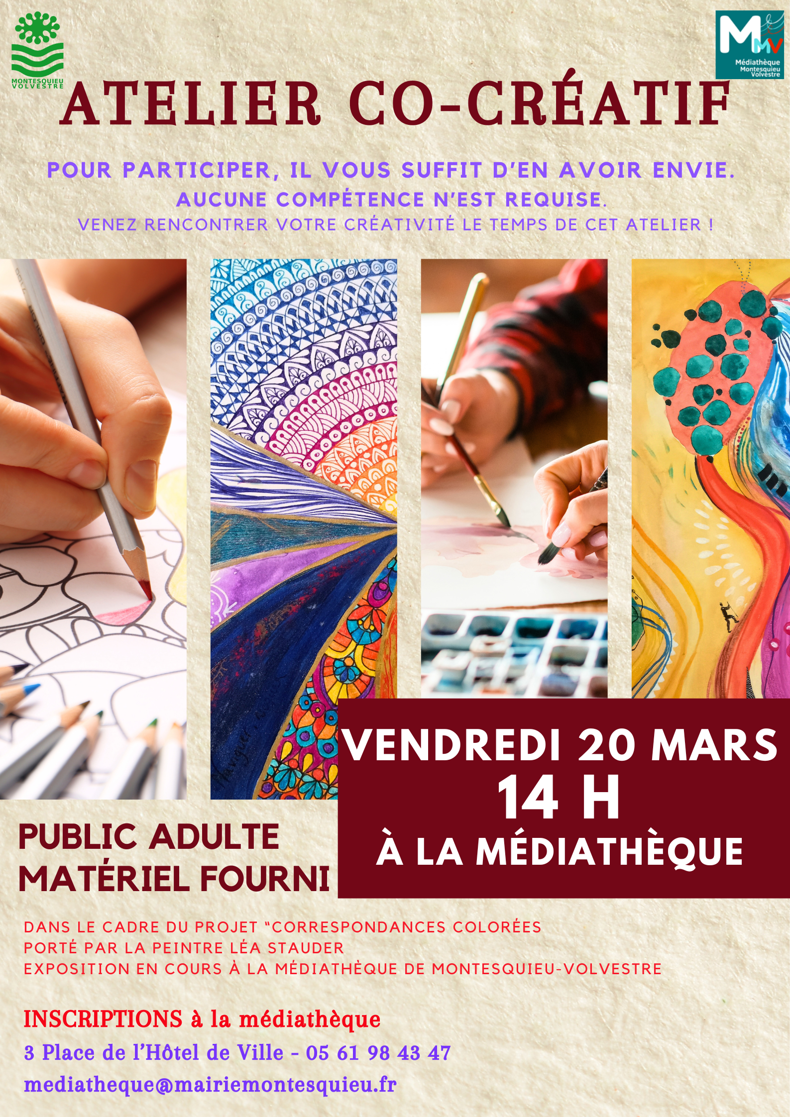 Dans le cadre de l'exposition "Correspondances Colorées", l'atelier est porté par la peintre Léa Stauder et proposé par la Médiathèque de Montesquieu-Volvestre.