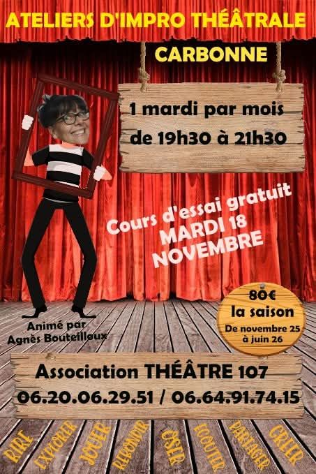 Ateliers d'impro à Carbonne, 1 mardi par mois de 19h30 à 21h30 de novembre 2025 à juin 2026 : 80€ la saison.