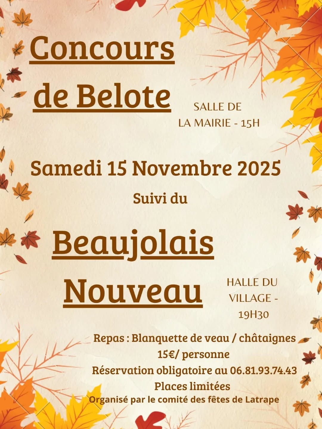 - Beaujolais nouveau, repas à 19h30 à la halle du village.