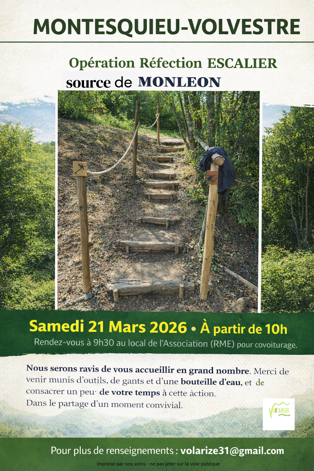 L'association Volarize vous propose de se défouler le samedi 21 mars à partir de 10h pour refaire les marches qui se trouvent à côté de la source de Monléon, là où le chemin bifurque vers Mesuret sur la route du Pacherou ou Ste Rame.