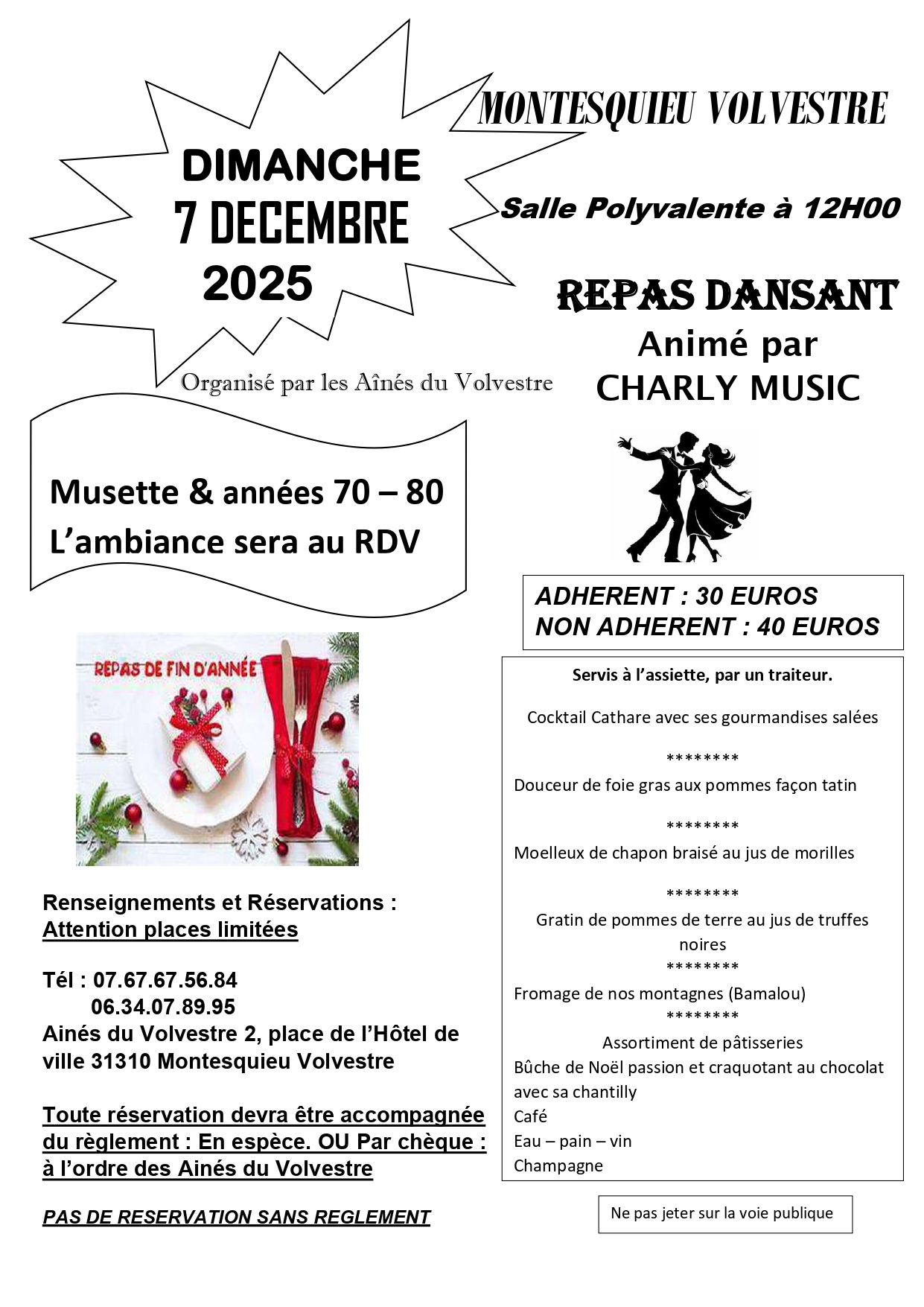 Toute réservation devra être accompagnée du règlement en espèce OU par chèque à l’ordre des Ainés du Volvestre.