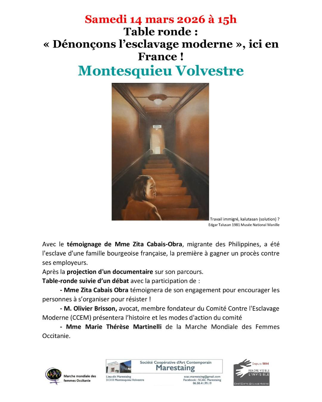 Avec le témoignage de Mme Zita Cabais-Obra, migrante des Philippines, a été l'esclave d'une famille bourgeoise française, la première à gagner un procès contre ses employeurs.