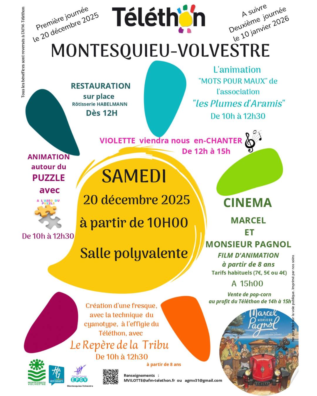 - Cinéma "Marcel et Monsieur Pagnol" à 15h à partir de 8 ans (7€, 5€ ou 4€) et vente de pop-corn de 14h à 15h au profit du Téléthon